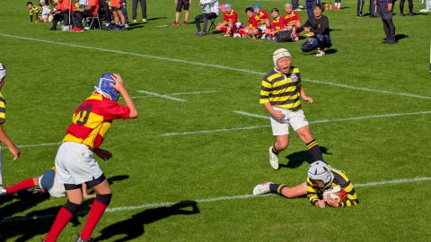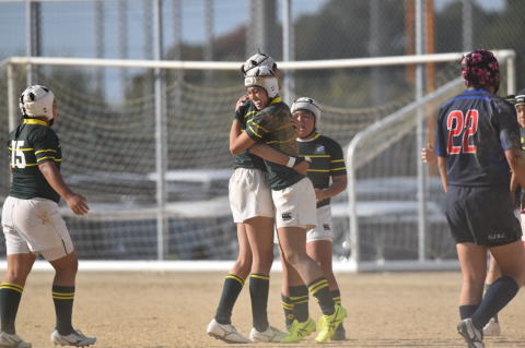 3試合目は、疲れもある中で大きな相手にゲインされ最後は外のランナーにトライを許す苦しい立ち上がりでしたが、粘り強くディフェンスからチャンスをつかみトライ、後半も痺れる展開で1トライずつ取り合い、最後はゴール前まで攻め込まれましたが、気持ちのこもったディフェンスでしのぎ歓喜の瞬間となりました。